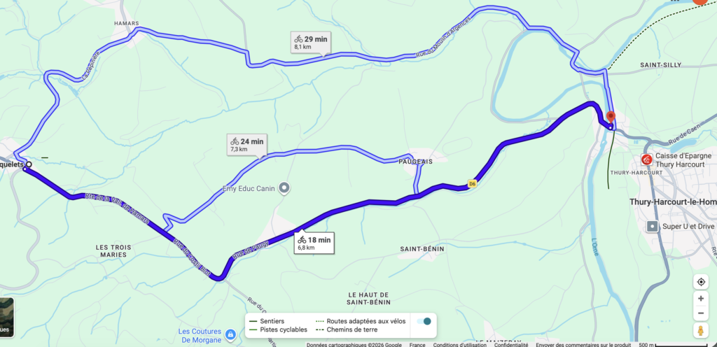 La route D6 pour venir au gîte de Thury Harcourt Le Hom (Vélo Francette) n’est pas aménagée pour les vélos, la distance est de 7km, la localisation du gîte est indiqué dans Google Maps ou Waze.